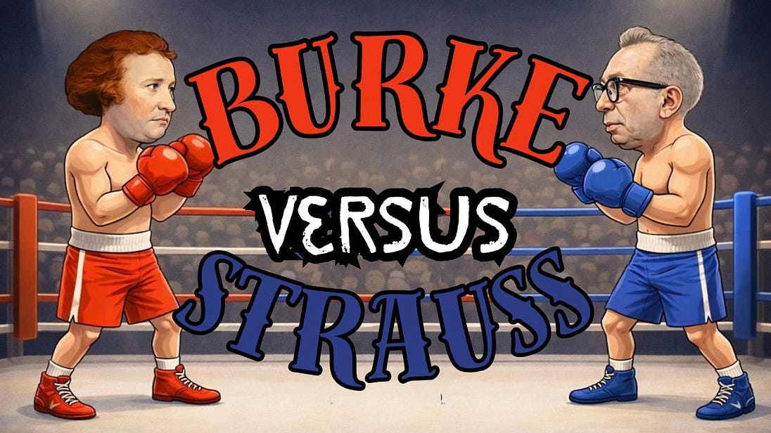 • Speaking of cage matches, on Wednesday, March 4 at 6 pm Eastern time, the very cheeky millenial-run Saving Elephants Substack is hosting a livestreamed debate pitting me and “Lucretia” against Prof. Lauren Hall of the Rochester Institute of Technology and Greg Collins of Yale University on the topic: “Conservative Cagematch - Burke vs Strauss.” Here’s their description:
