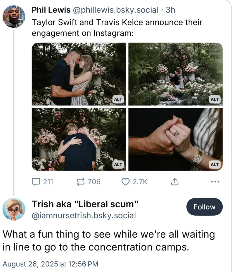 Oh yeah, Taylor Swift and Travis Kelsey are getting married, which is an obvious cynical ploy to drive Sydney Sweeney from the headlines. (Also, there was a suspicious amount of trading in marriage news contracts on the betting markets 48 hours ahead of the announcement. The SEC needs to investigate!)