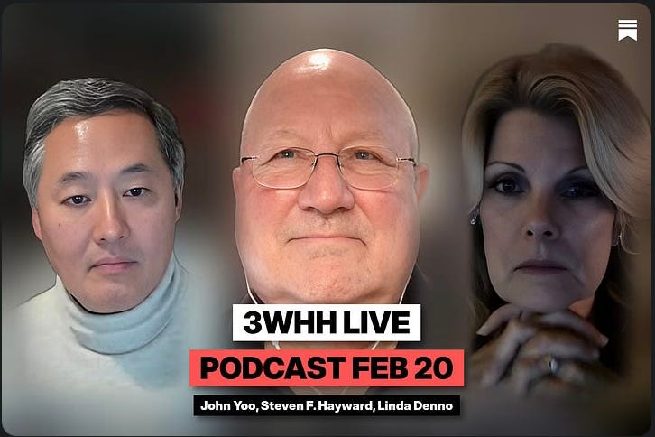 On the 3WHH, we ponder whether the Supreme Court's tariff case was a no-lose case for conservatives, as I argued, or a serious setback for President Trump? We were just surprised John Yoo had any voice left at all to break it down for us after being on call throughout the day for Fox News, but he saved his best for us. Hint: The fact that the three liberals on the Court wrote concurring opinions disagreeing with Chief Justice Roberts's reasoning behind the decision suggests some useful mischief at work in the decision.