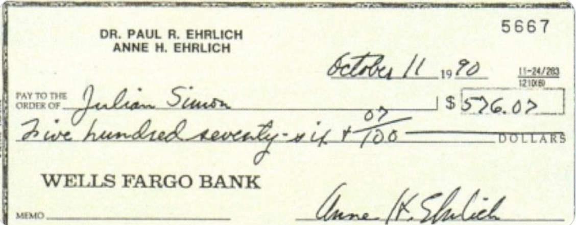 In any case, the great economist Julian Simon, who I got to know quite well before his untimely passing in 1998, in 1980 pitched a $1,000 bet to Ehrlich and his occasional fellow Malthusian co-author (and later Obama science adviser) John Holdren, in which Ehrlich and Holdren could pick five resources, with Simon contending their inflation-adjusted prices would be lower a decade later. Ehrlich picked copper, chromium, nickel, tin, and tungsten. Simon won on all five, and Ehrlich paid up in inflation-adjusted dollars for the changes in prices of each commodity (under the peculiar terms of the bet). Julian shared a pic of the check with a lot of us—the ultimate receipt: