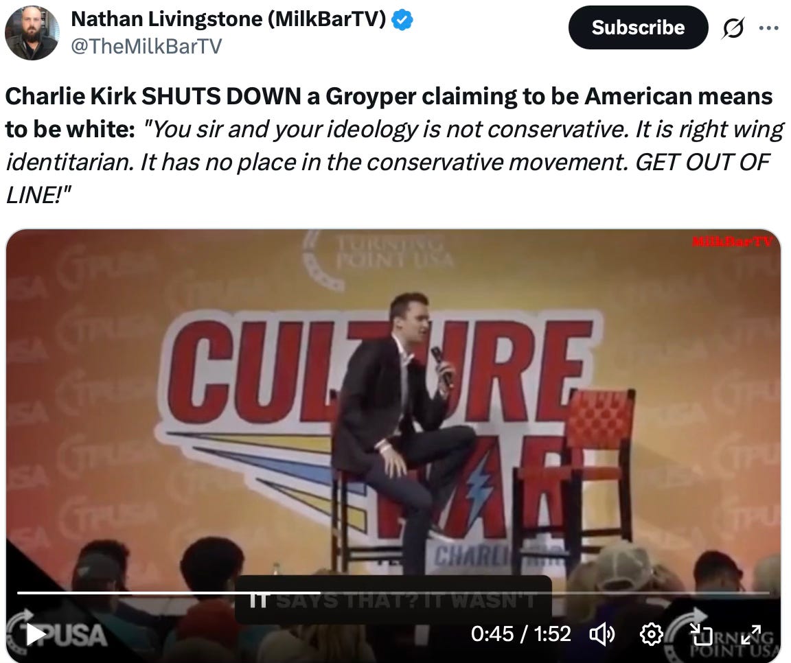 Here’s Kirk dealing with a Fuentes follower who claims that America is a “European nation for white men of good stock”: