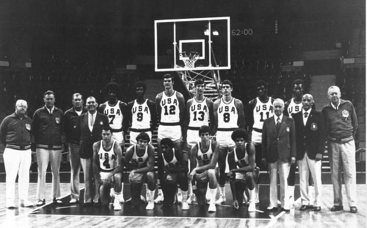 In 1972 the USA fielded its youngest-ever men’s basketball team: Mike Bantom, Jim Brewer, Tom Burleson, Doug Collins, Kenny Davis, James Forbes, Tom Henderson, Bobby Jones, Dwight Jones, Kevin Joyce, Tom McMillen and Ed Ratleff. The American collegians faced a more experienced Soviet team, for all practical purposes a professional squad.