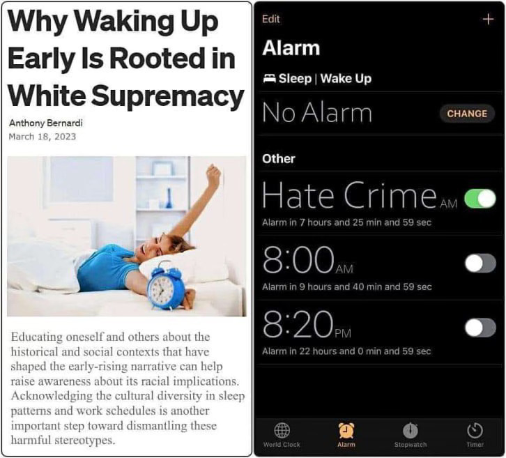 Waking up on time being racist seems like it is patronizing non-whites by saying that they are too lazy to get to work on time.