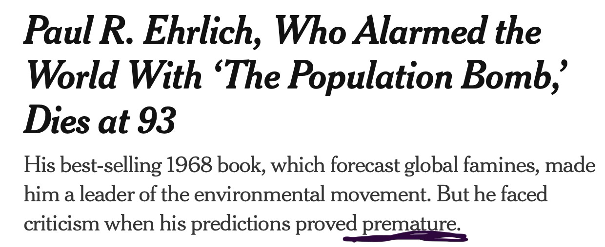 As it happened, Ehrlich’s book appeared right at the peak year for world fertility, which has been falling precipitously ever since. Now the most pressing population problem is that fertility rates have fallen so fast that in a century or less from now, falling global population may be one of humanity’s most pressing problems. (For example, if South Korea’s fertility rate, already far below replacement level, keeps falling, the last South Korean will be born about 30 years from now.)