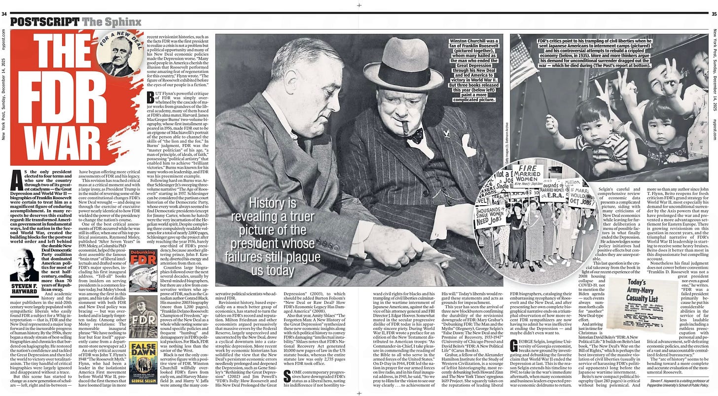 • THE FDR WARS: So I appear today in the New York Post’s “Post Script” section with what is called in the tabloid and magazine trade a “double-truck” spread (two full pages) on the theme of how the arc of history may be bending toward justice for FDR, at least if several recent books have anything to say about it. And they have a lot to say about it. I don’t have an online link for it yet, but here’s what it looks like in print, so head to your local newsstand: