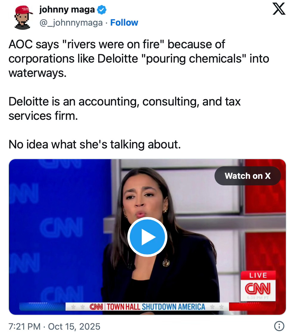 She probably means Dow Chemical or DuPont or something, but it is doubtful that either company was remotely responsible for any of the Cuyahoga River fires that all happened nearly (checks notes) 60 years ago now.
